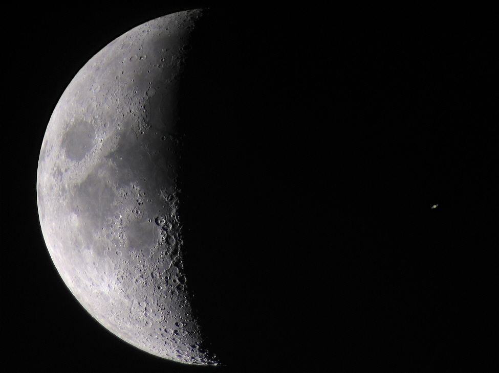 To co ten teleskop potrafi pokazać na Księżycu ciężko jest opisać słowami. Przy dogodnej fazie w pobliżu terminatora obraz kraterów sprawia, że człowiek zapomina o oddychaniu: cud, miód, malina i truskawki. Obraz jest niezwykle plastyczny, ma się dosłownie wrażenie unoszenia się nad powierzchnią Księżyca. Niestety muszę napisać, że wrażenia psuje nieco aberracja. Ujawnia się ona szczególnie mocno w cieniach, które są po prostu fioletowe. Ale i tak nie przeszkadza to w obserwacjach nawet z powiększeniem 600x. Stosując barlowa x2 z zestawu z przedłużką o ok. 5,5cm i zoomem LV nawet przy tak ekstremalnym powiększeniu nie widać zbyt dużej degradacji obrazu. Obraz kraterów i gór księżycowych pozostaje bardzo ostry, a co ciekawe aberracja chromatyczna jest w tym układzie znacznie mniejsza. Nie wiem na ile to zasługa zmniejszenia jasności, a na ile jakaś cudowna korekcja wad, ale tak faktycznie jest. Szczególnie pięknie prezentują się takie szczegóły jak Kopernik, Platon, Clavius, Mare Crisium. Pięknym widokiem jest również światło popielate, które przy małych fazach wręcz umożliwia obserwację co wyraźniejszych struktur na ciemnej stronie Księżyca. Niektóre z nich przedstawiają zdjęcia, które jednak nie są w stanie w pełni oddać tego widoku z okularu.