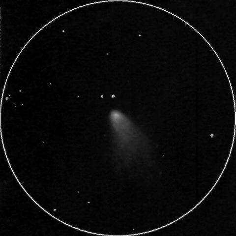 Obserwowałem ją gdy była widoczna gołym okiem. W szukaczu widoczna w postaci rozmytej gwiazdy. Teleskop pokazuje jasne, gwiazdopodobne jądro i nieco niesymetryczną otoczkę podzieloną jakby na dwie części: jaśniejszą wewnętrzną i słabszy zewnętrzną. Najlepsza w 60x.